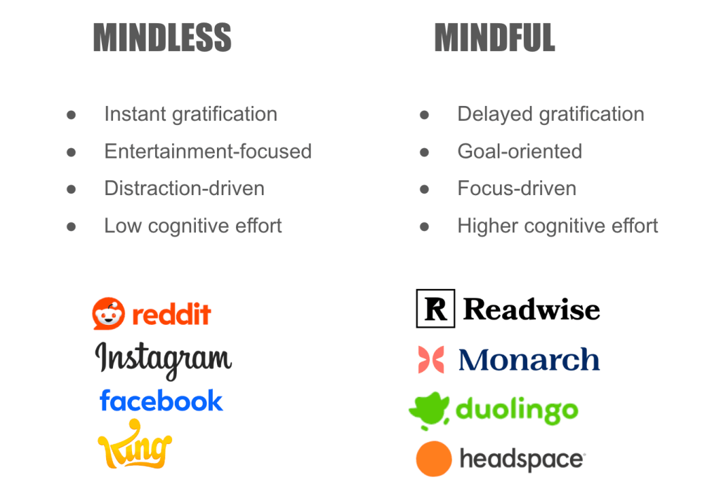 Mindful products: These are goal-oriented products. They generally require more user investment. The main goal is either some longer-term benefit (e.g., mental, physical, financial health) or a short-term productivity-oriented benefit. Examples include meditation apps like Headspace, fitness trackers like Fitbit, personal finance tools like Monarch, and learning tools like Duolingo or Quizlet.